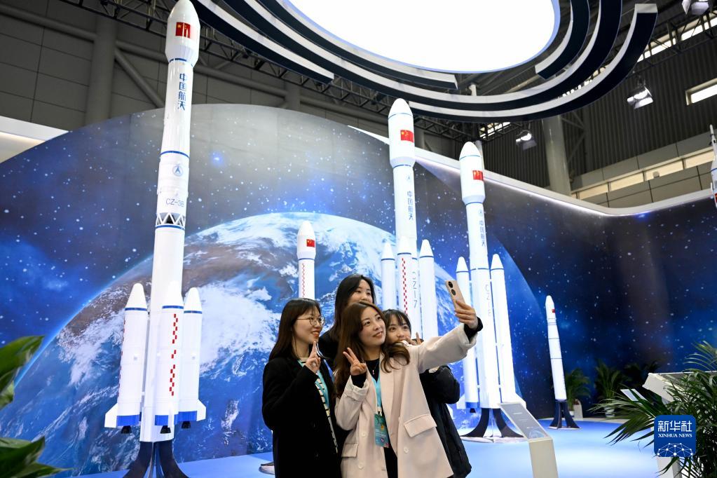 4月24日,观众在2023年“中国航天日”科普展览上合影留念。