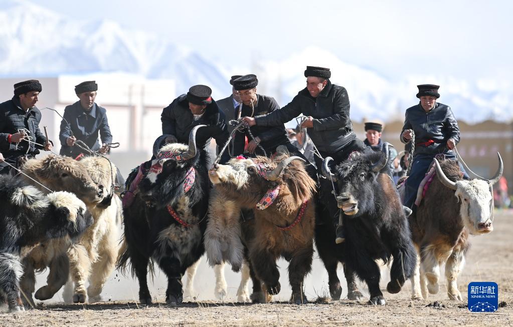 新疆塔什库尔干塔吉克自治县,选手在肖贡巴哈尔节开幕式上进行“牦牛叼羊”比赛(3月21日摄)。肖贡巴哈尔节是塔吉克族的传统节日,有“新年”“迎春”之意。