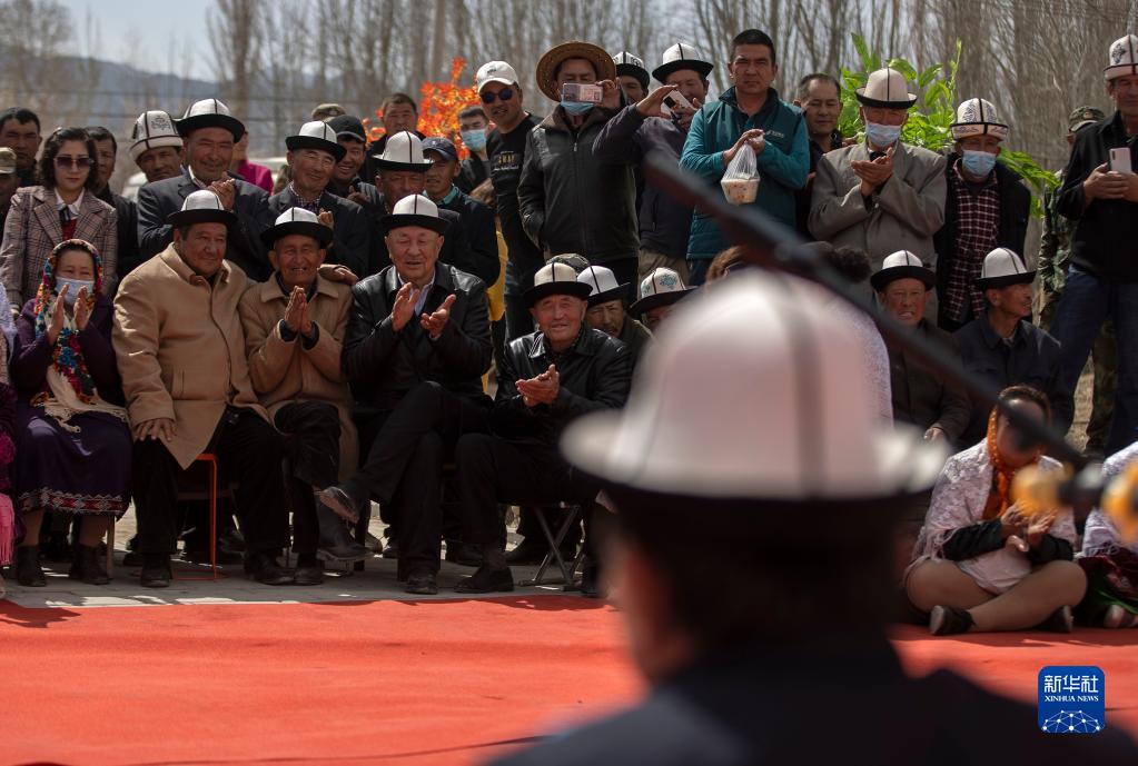 新疆克孜勒苏柯尔克孜自治州别迭里村,观众为《玛纳斯》非物质文化遗产传承人阿不都别克·俄斯坎的表演鼓掌喝彩(4月10日摄)。