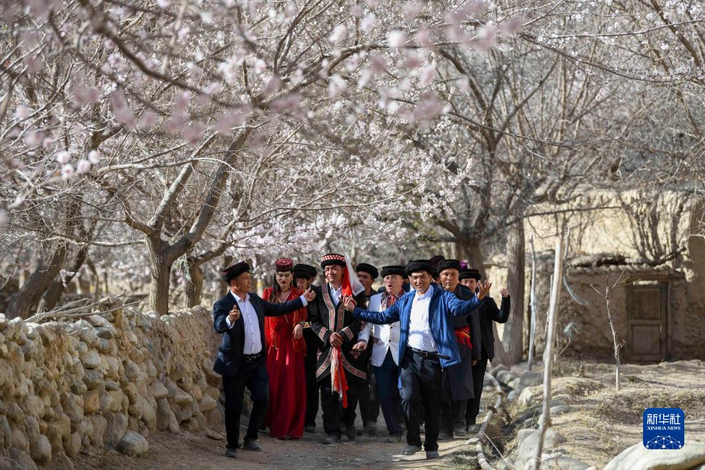 新疆阿克陶县塔尔塔吉克民族乡巴格艾格孜村,人们为游客表演传统婚俗中的迎亲仪式(3月28日摄)。