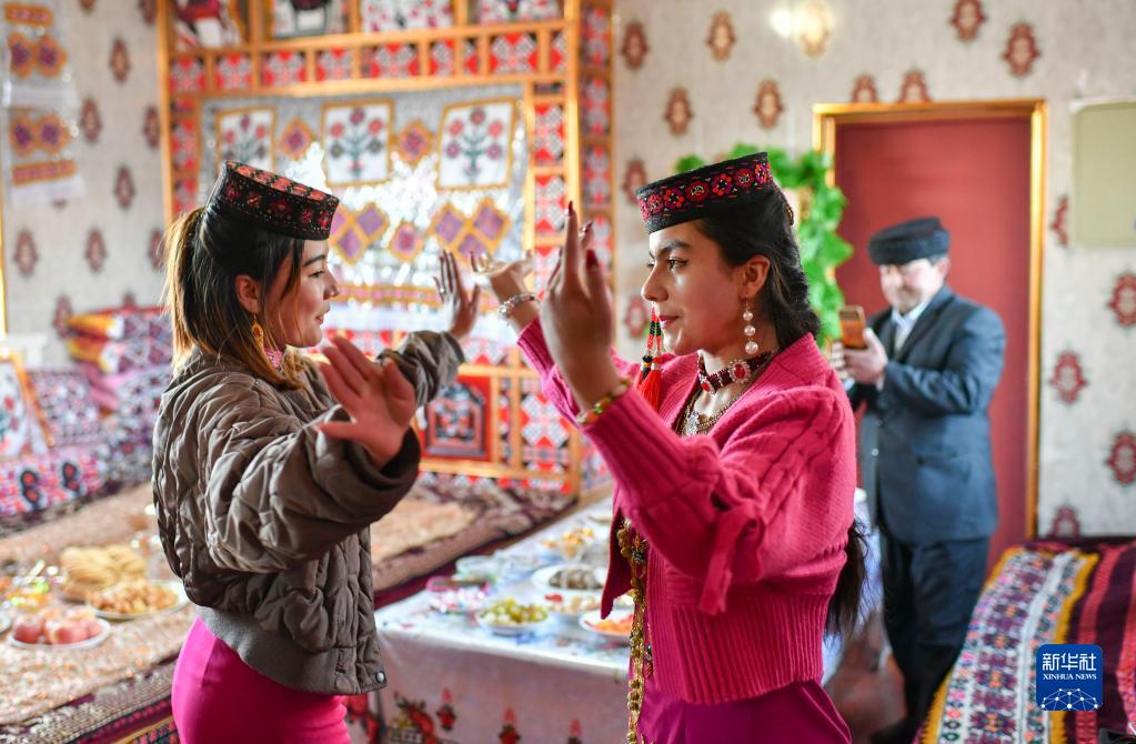 新疆塔什库尔干塔吉克自治县爱民村,牧民都热·加尔曼的侄女古扎丽努尔(前右)带着好朋友来串门拜访,都热·加尔曼在一旁拍摄视频(3月21日摄)。2018年冬,都热一家享受易地扶贫搬迁政策,搬迁至距离县城约30公里的新村。在惠民政策的引导下,都热一家靠双手创造了与祖辈不同的新生活。