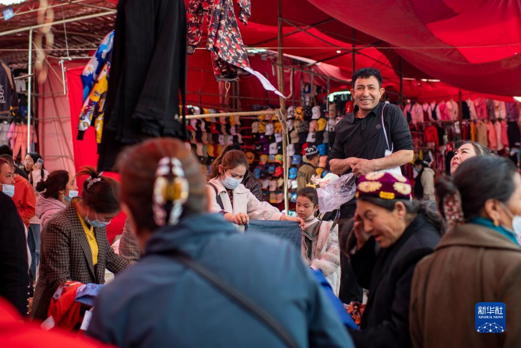 新疆莎车县综合巴扎上的一名服装商贩站在摊位上吆喝,吸引顾客前来购买(3月12日摄)。