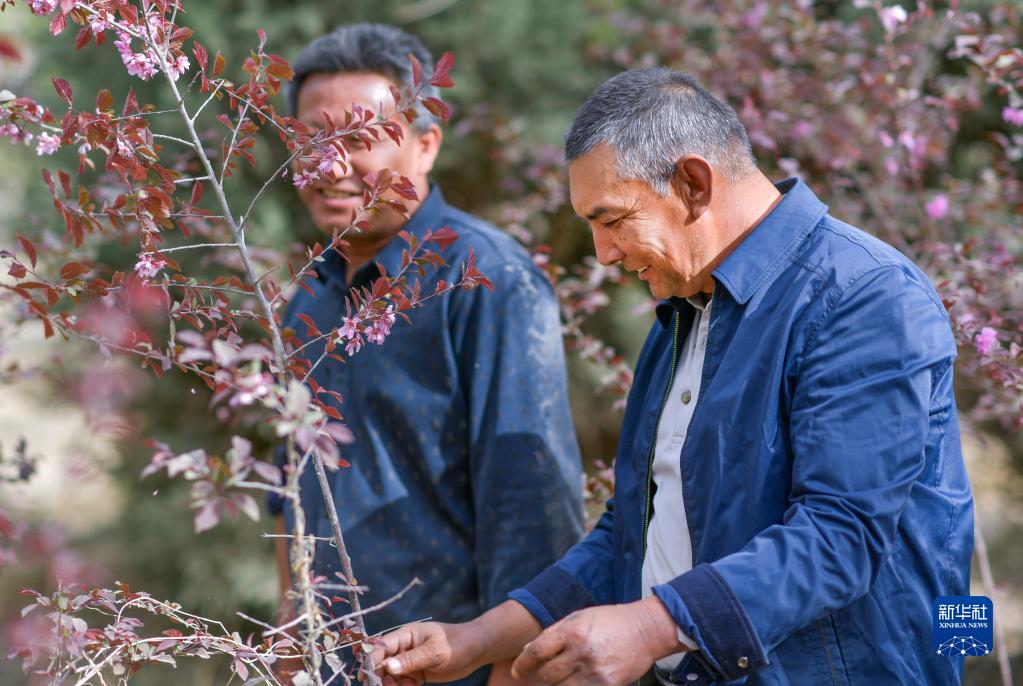 新疆叶城县一处种苗场内,人们在挑选树苗准备栽种(4月16日摄)。