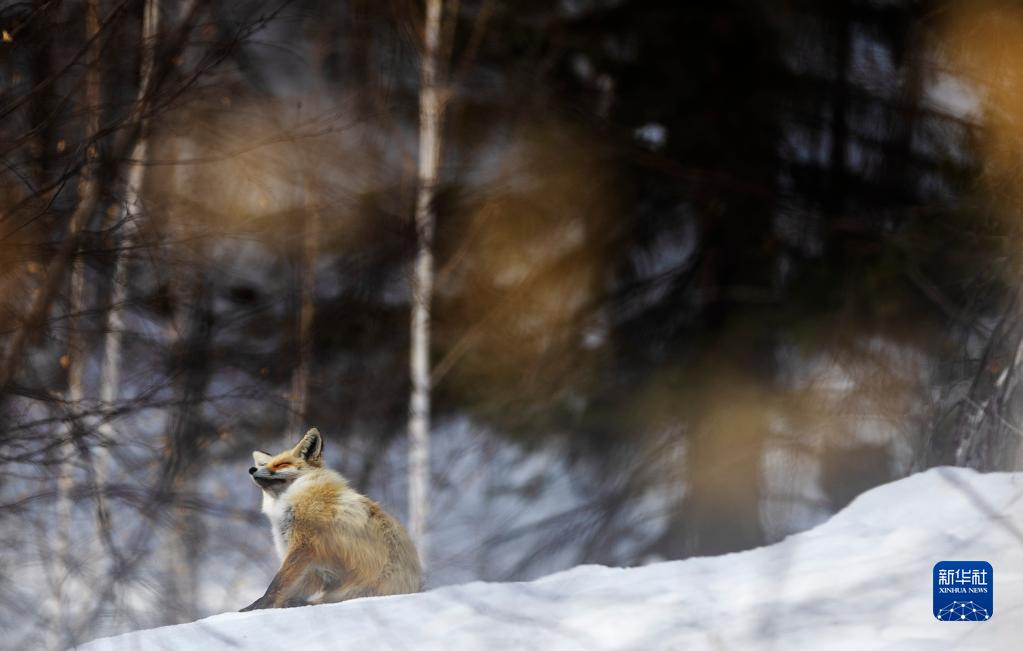 在新疆喀纳斯风景区小憩的赤狐(3月29日摄)。