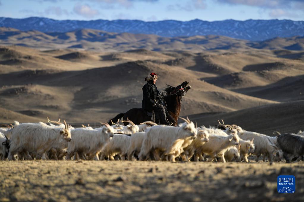 新疆塔城地区裕民县,牧归时分,牧民哈布得拉什么骑马赶着羊群行进在春草场上(4月12日摄)。