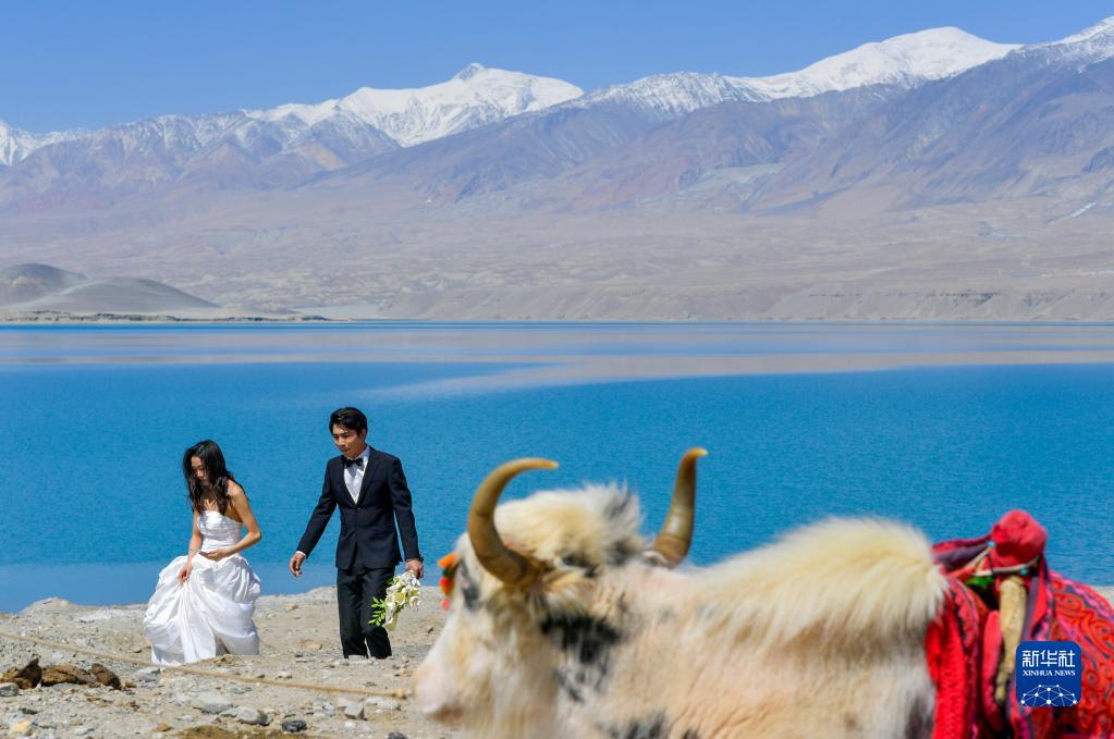 新疆阿克陶县境内的白沙湖风景区,一对年轻人在湖边拍摄婚纱照(4月14日摄)。