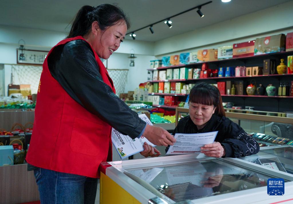 4月24日,在建德市梅城镇古街一家商铺内,志愿者在进行亚运知识宣传。