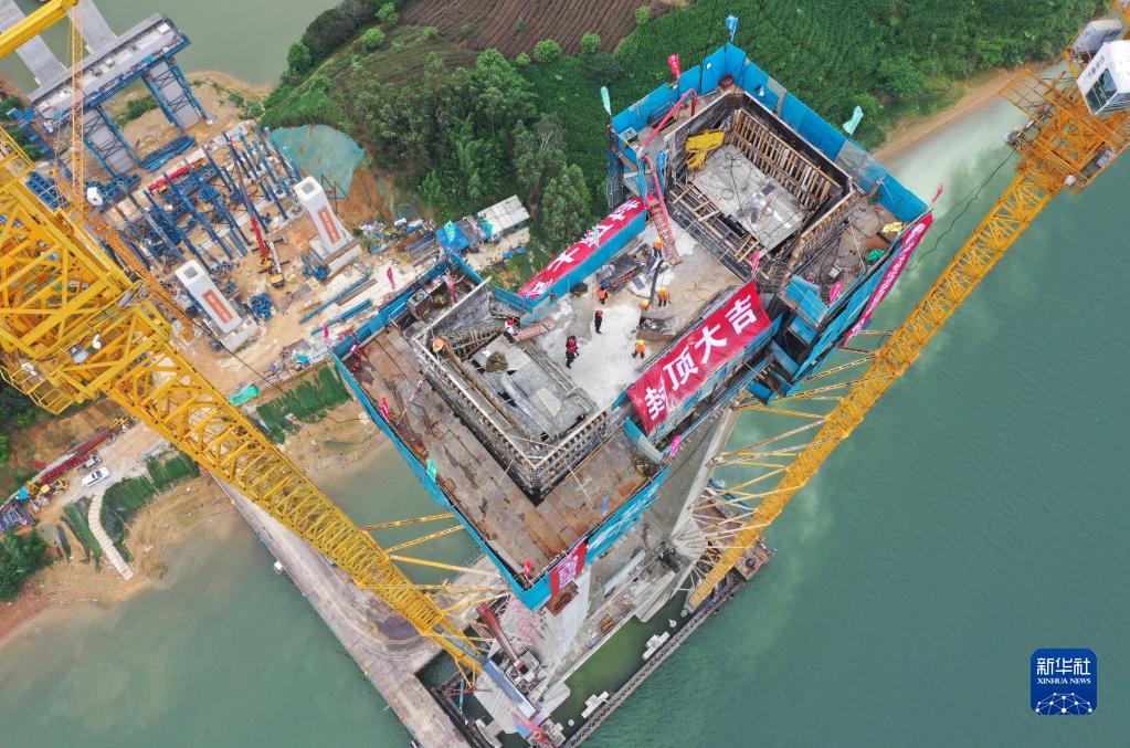 4月24日,在广西上横高速公路西津郁江特大桥建设现场,中铁四局集团工人在进行主塔封顶施工(无人机照片)。