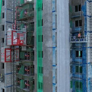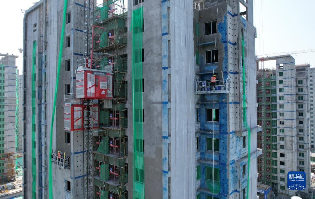 4月25日,中铁二十局的工人在石家庄市高新技术产业开发区集中安置区棚户区改造项目建设工地施工(无人机照片)。