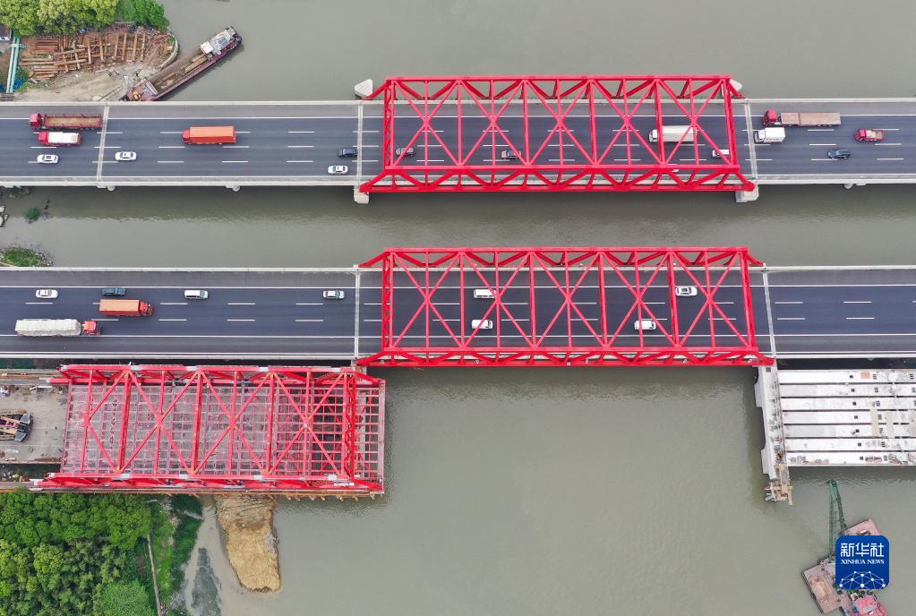 4月25日拍摄的沪宁高速公路青阳港大桥南半幅钢桁梁施工现场(无人机照片)。