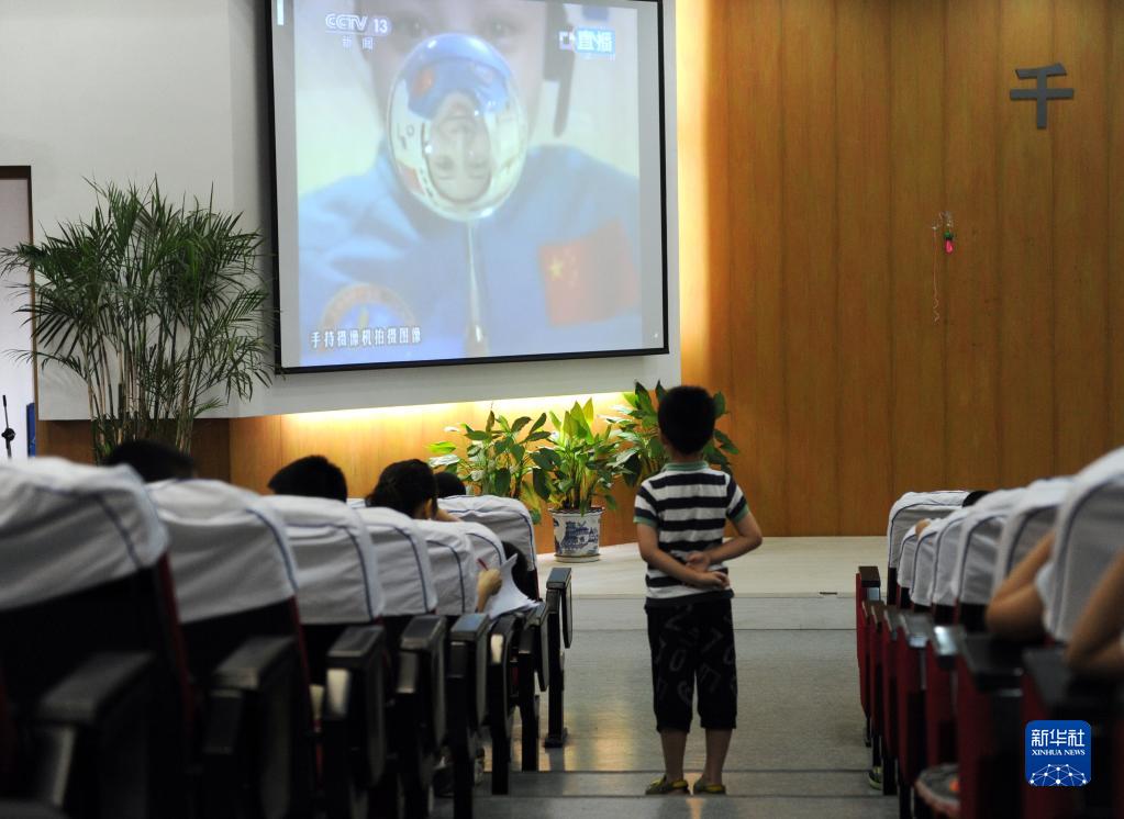 在杭州保俶塔实验学校,小学生吴潼站在走道上观看太空授课(资料图片,2013年6月20日摄)。当日,航天员王亚平在聂海胜、张晓光协助下进行首次太空授课,全国6000余万名中小学生观看授课直播。