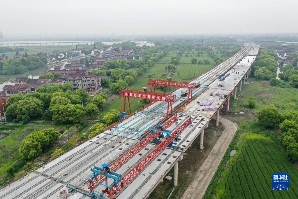 4月25日拍摄的苏台高速公路七都至桃源段ST-QL5标施工现场(无人机照片)。