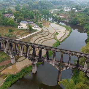 目前,四川省泸县正值插秧时节,有“人工天河”之称的泸县引水渡槽越过山丘、穿过农田,仍在引水灌溉中发挥重要作用。