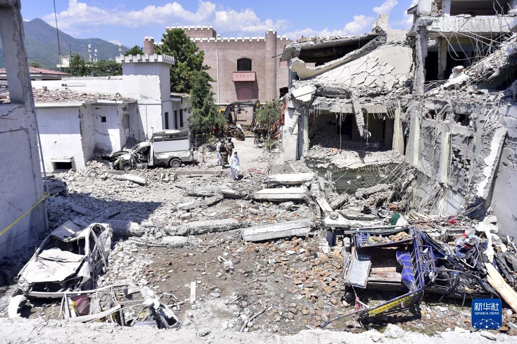 这是4月25日在巴基斯坦斯瓦特地区卡巴尔镇拍摄的爆炸事件现场。