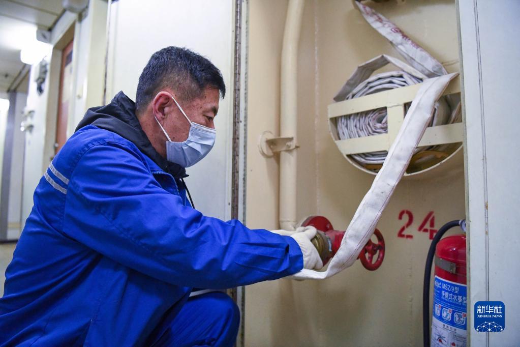 4月25日,中铁渤海号渡船的工作人员检查船上的消防设施。