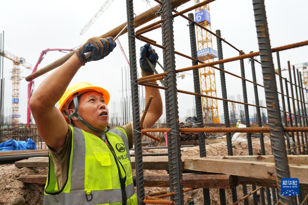 中铁上海工程局施工人员在深圳地铁5号线上水径停车场建设现场绑扎底板独立基础钢筋笼(4月25日摄)。