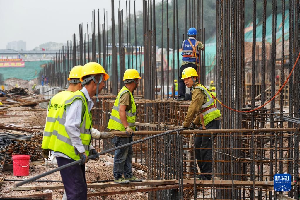 中铁上海工程局施工人员在深圳地铁5号线上水径停车场建设现场搬运钢筋(4月25日摄)。