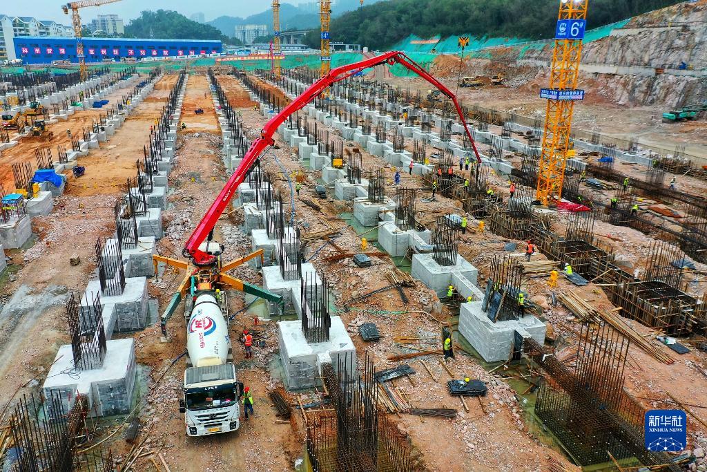 建设中的深圳地铁5号线上水径停车场正在进行底板独立基础混凝土浇筑和钢筋笼绑扎作业(4月25日摄,无人机照片)。