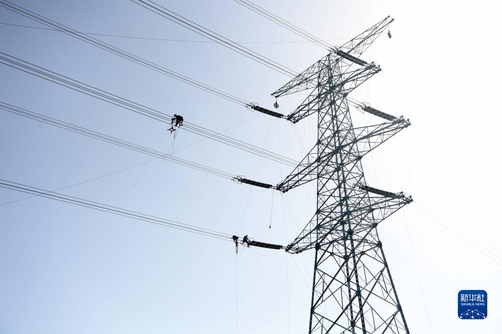 电力工人刘李家、段信阳、王春龙在高空作业(4月20日摄)。