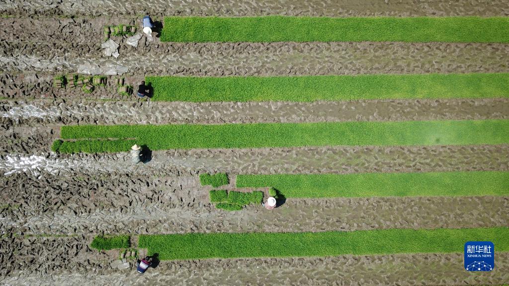 4月26日,在湘潭市雨湖区姜畲镇易建河村,农民在田间起秧(无人机照片)。