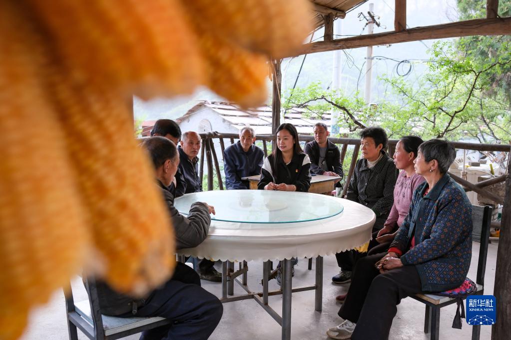陈晓丽(中)同村干部和村民代表商讨村里老房子改造事宜(4月18日摄)。新华社记者 张铖 摄