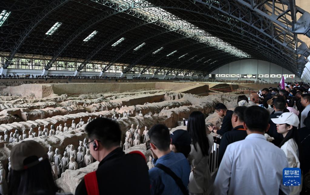 4月26日,游客在秦兵马俑一号坑遗址内参观。