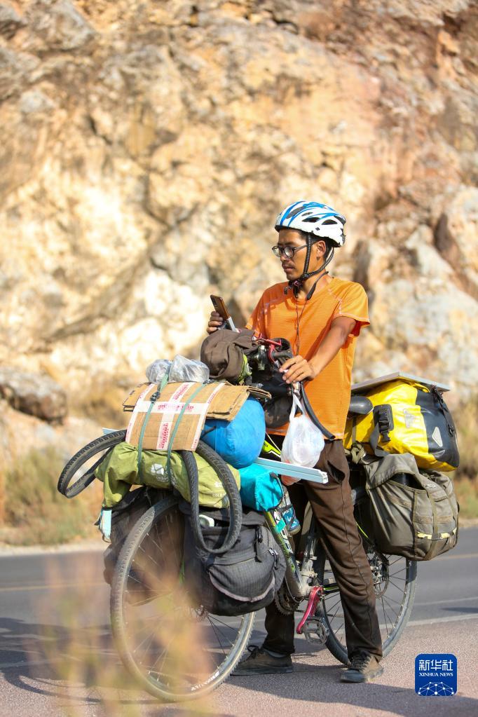 4月19日,来自广东的骑行爱好者潘有辉在云南大理洱海边查看导航。数月前他从广东佛山出发,一路骑行抵达大理。
