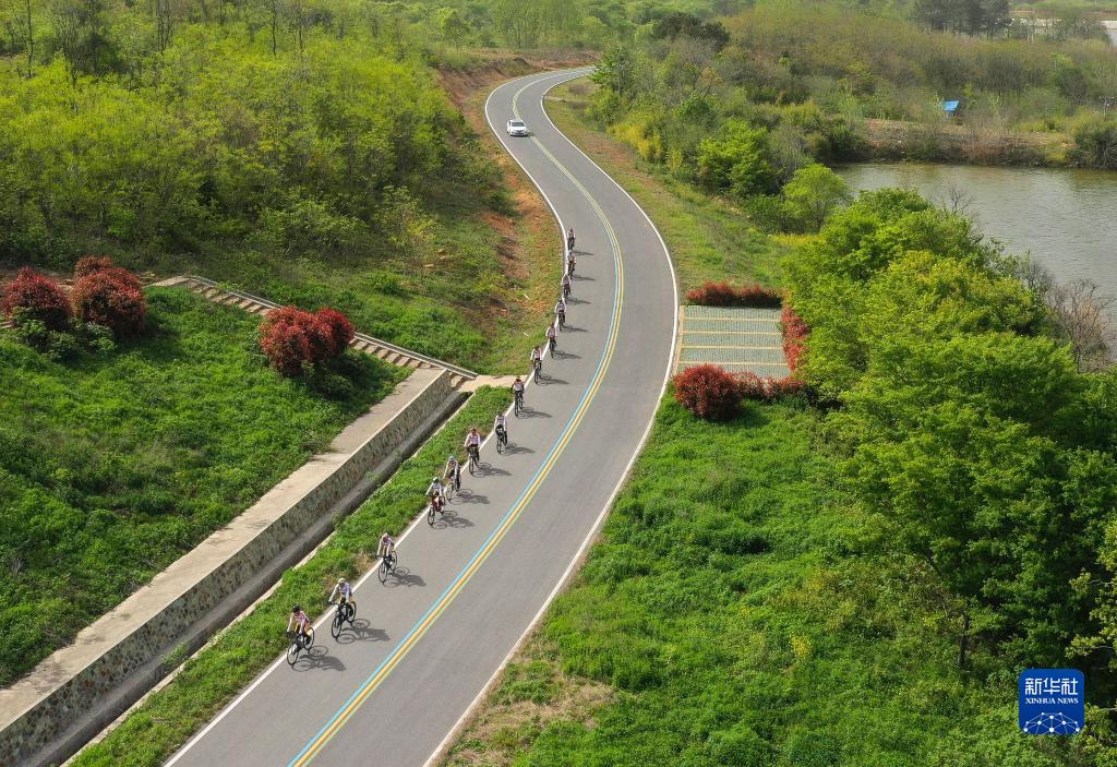 4月12日,骑行爱好者在江苏省句容市天王镇骑行(无人机照片)。