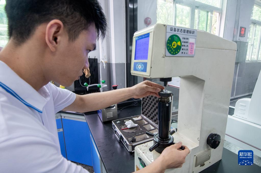 4月13日,在深圳市喜德盛自行车股份有限公司实验室,工作人员在检测自行车零件吊耳的硬度。