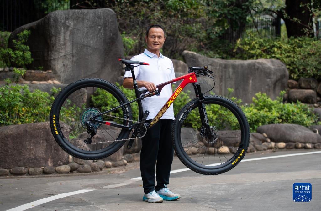 4月13日,在深圳市喜德盛自行车股份有限公司,工作人员单手轻松拎起由超轻碳纤维材料打造的自行车。该车型曾经作为中国国家山地自行车队东京奥运战车,整车重量仅9.6千克。