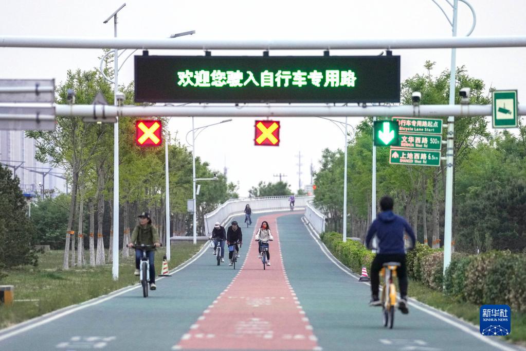 4月17日,市民在北京自行车专用路上骑行。北京自行车专用路是国内首条通勤用自行车专用路,道路全长6.5公里。