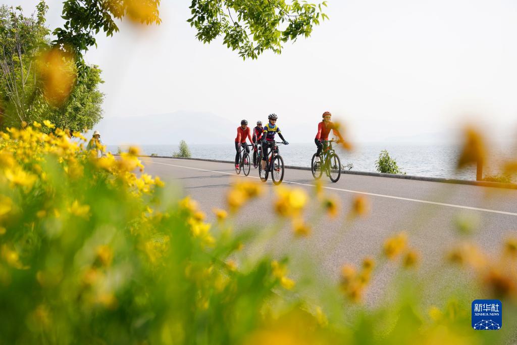 4月20日,骑行爱好者在云南大理洱海生态廊道骑行。