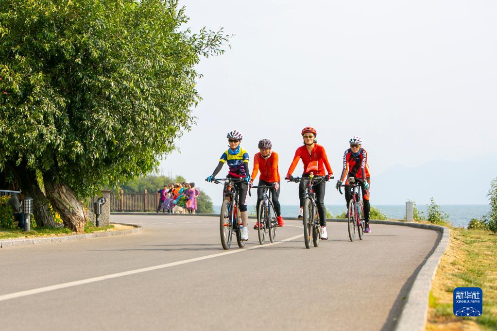 4月20日,骑行爱好者在云南大理洱海生态廊道骑行。