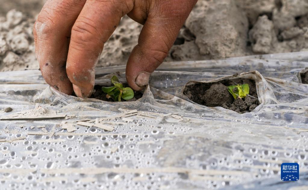 新疆尉犁县巴西买里村,尔肯·热衣木用手拨开地膜,让棉花嫩芽钻出(4月22日摄)。因为地势变化等原因,即使松土设备驶过,仍有一些棉花嫩芽无法钻出地膜。
