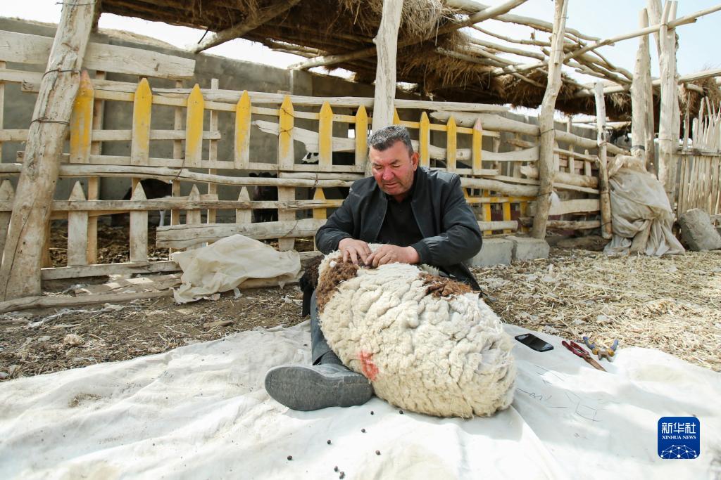 新疆尉犁县巴西买里村,在棉田旁的羊圈里,尔肯·热衣木在剪羊毛(3月29日摄)。