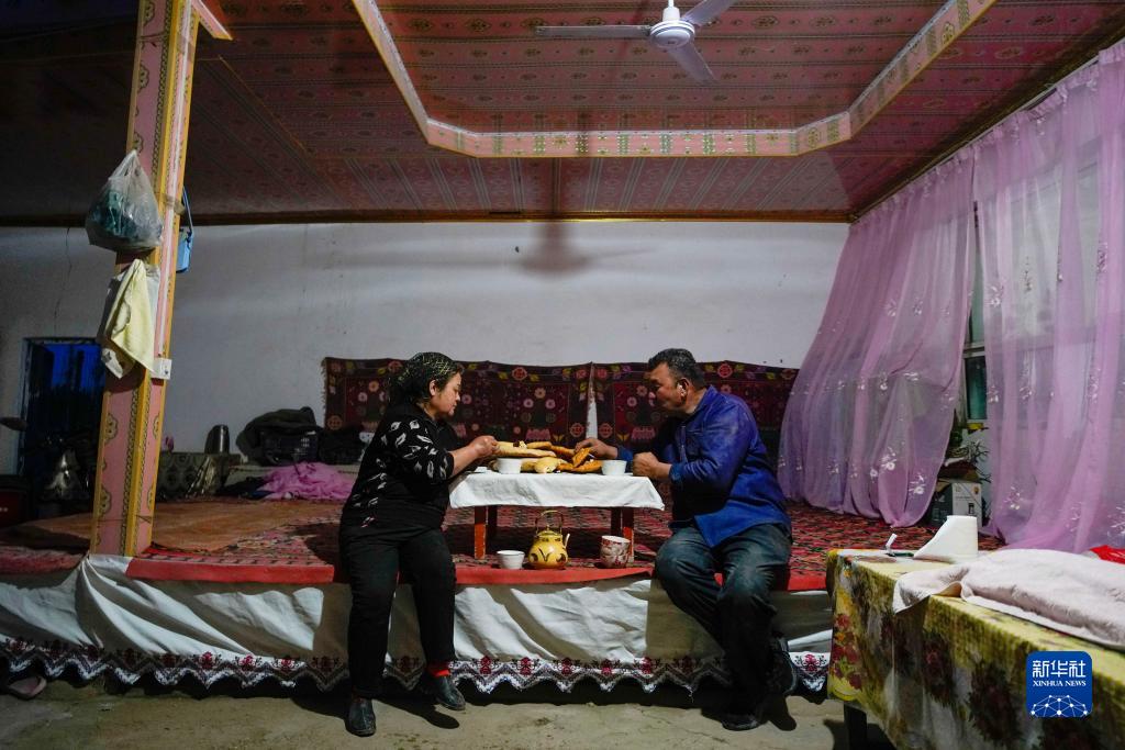 新疆尉犁县巴西买里村,一个馕、一碗热茶,忙碌了一天的尔肯·热衣木和爱人一起吃晚餐(4月21日摄)。