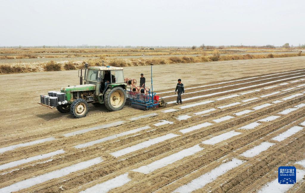 新疆尉犁县巴西买里村,尔肯·热衣木驾驶拖拉机春播(4月17日摄,无人机照片)。