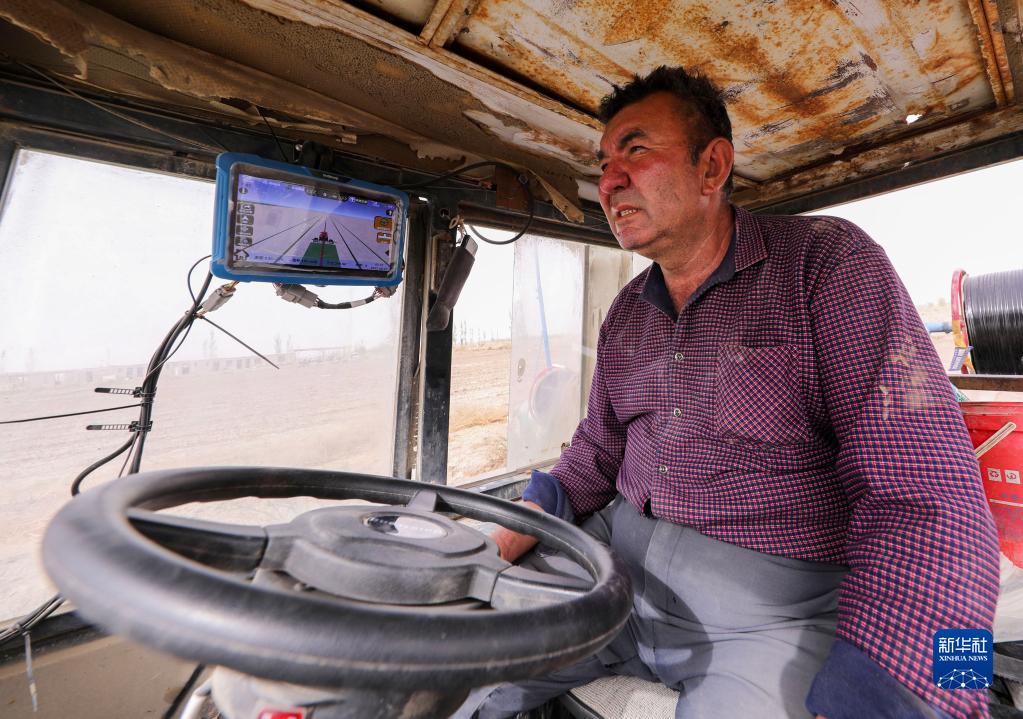新疆尉犁县巴西买里村,尔肯·热衣木在装有北斗导航系统的拖拉机上(4月17日摄)。