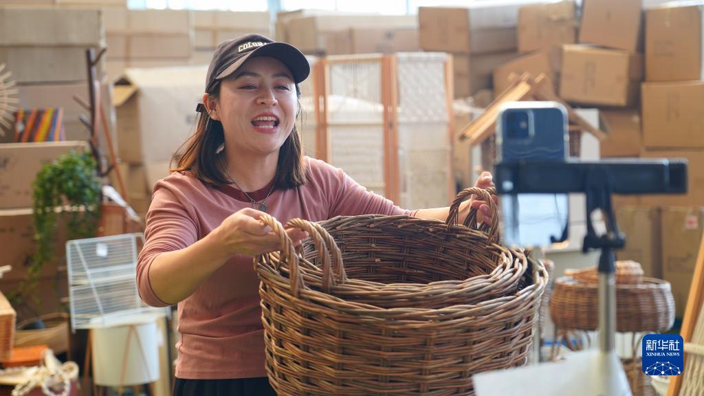 4月26日,临沭县欧拉工艺品有限公司员工通过电商销售柳编制品。