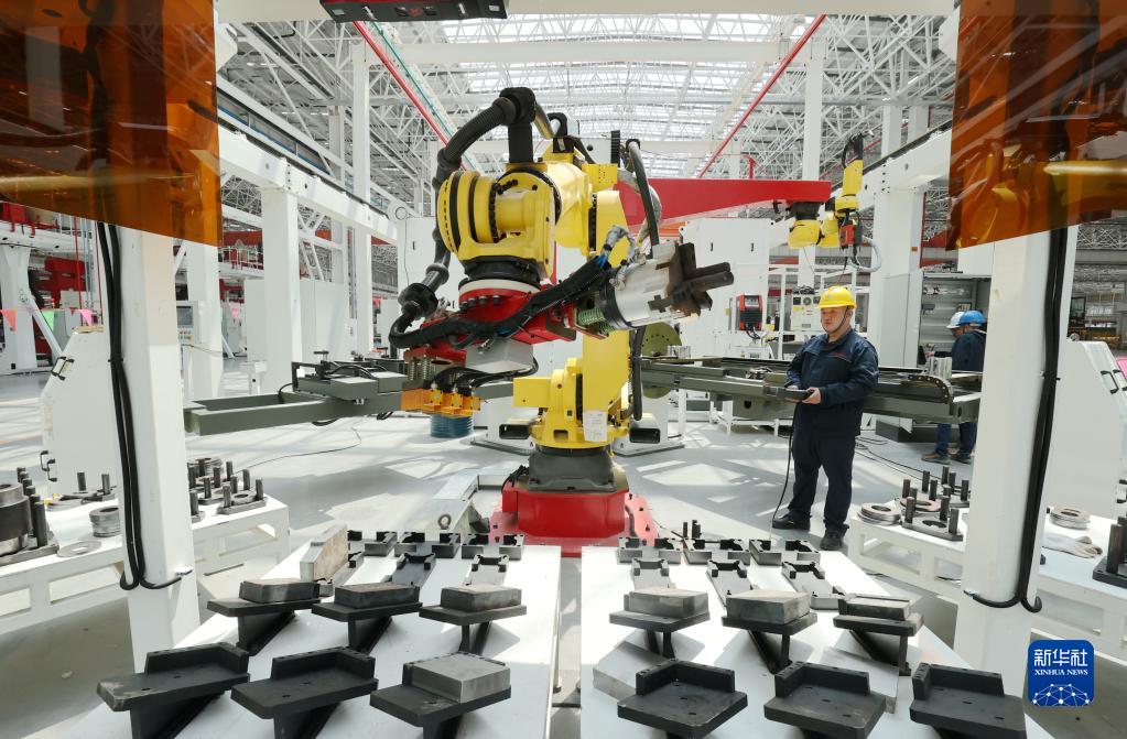4月27日,在位于浙江湖州市吴兴高新区的浙江三一装载机智能制造基地,工人在调试智能化生产线。