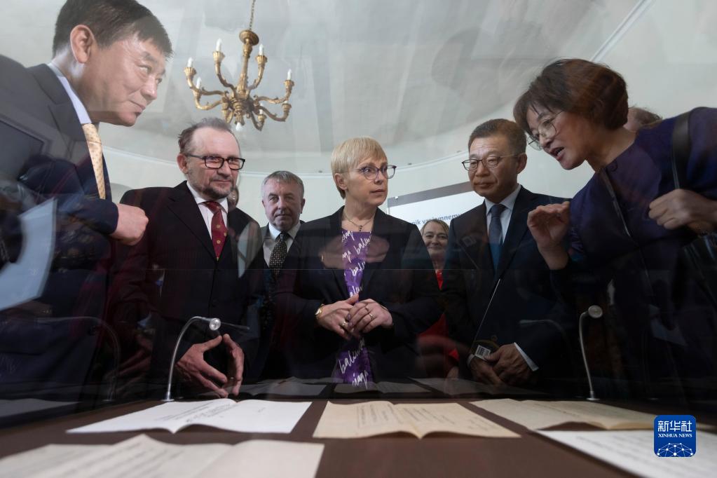 4月26日,在斯洛文尼亚卢布尔雅那的斯洛文尼亚共和国档案馆,斯洛文尼亚总统穆萨尔(中)在刘松龄与玑衡抚辰仪文献展上听取专家讲解。