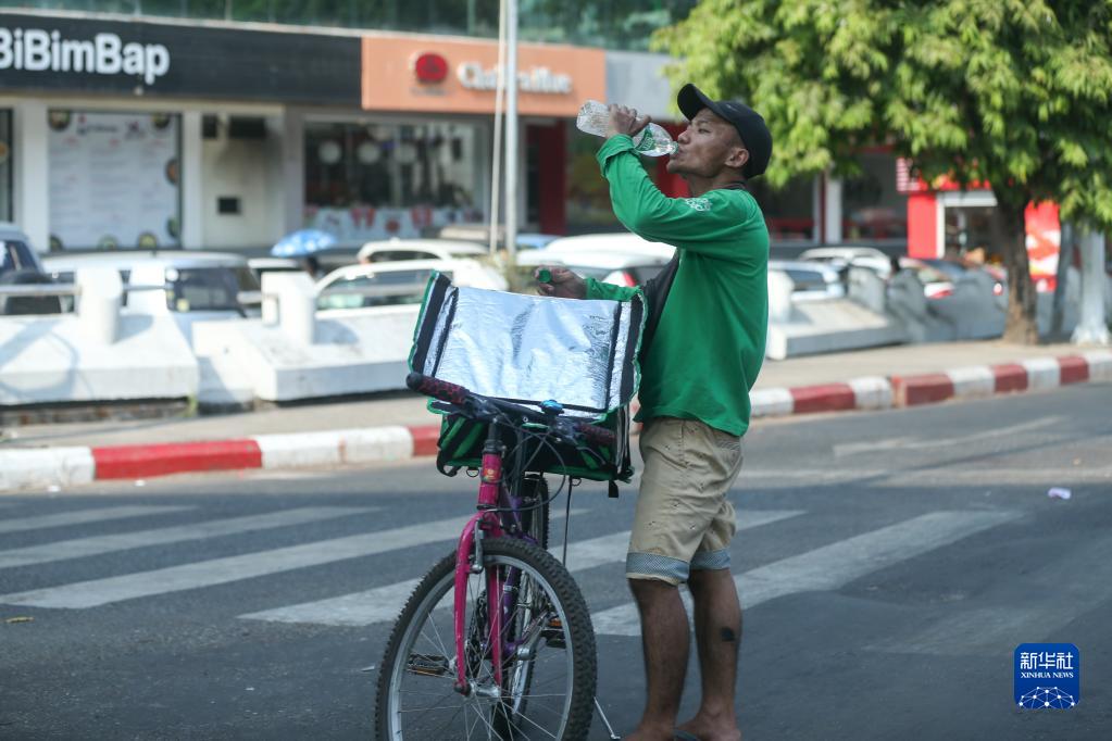 4月27日,一名男子在缅甸仰光街头喝水消暑。