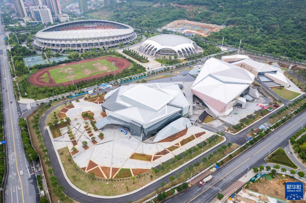 这是4月28日拍摄的建设中的郴州市文体中心(无人机照片)。