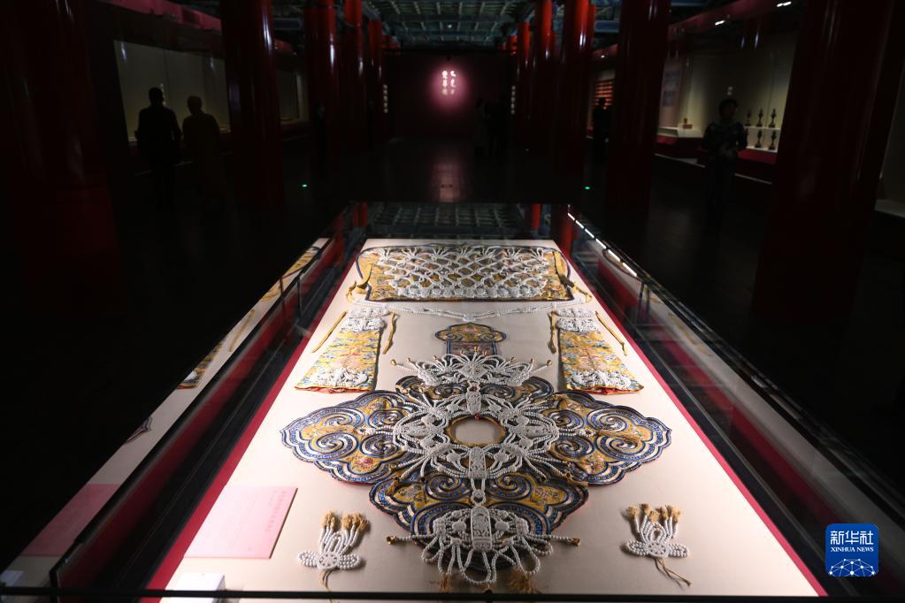 这是4月28日在北京故宫博物院拍摄的黄色缎绣缀砗磲璎珞衣。