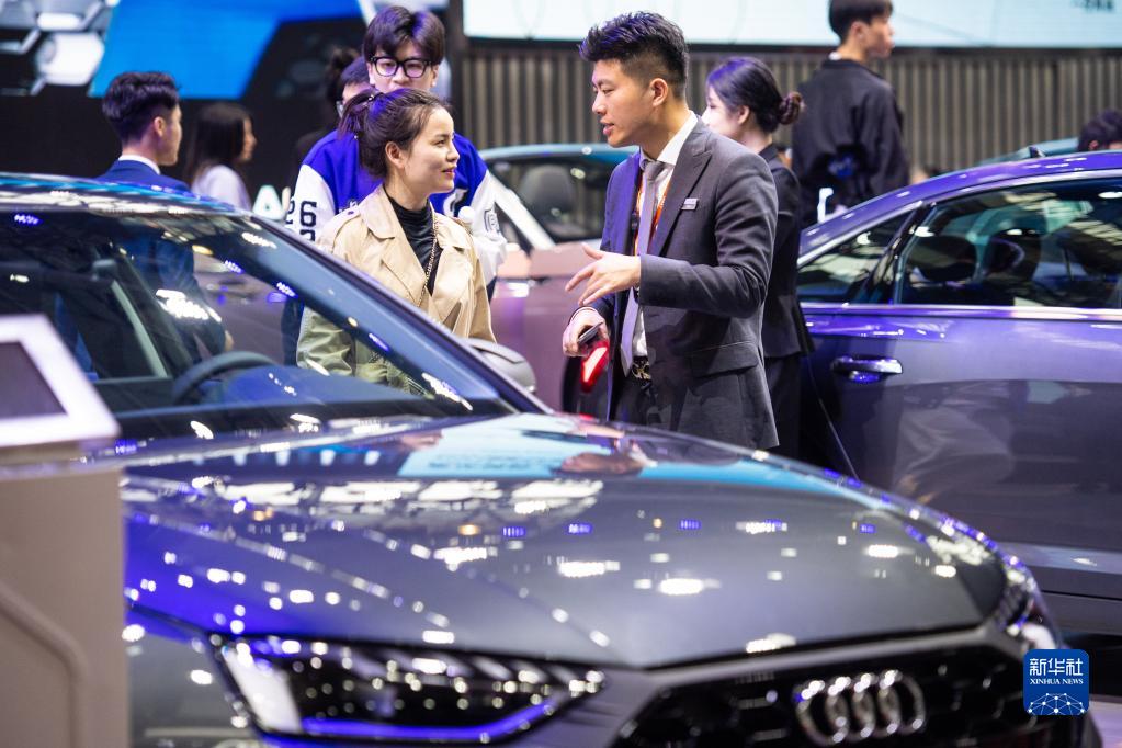 4月28日,工作人员(右)向观众介绍参展汽车。