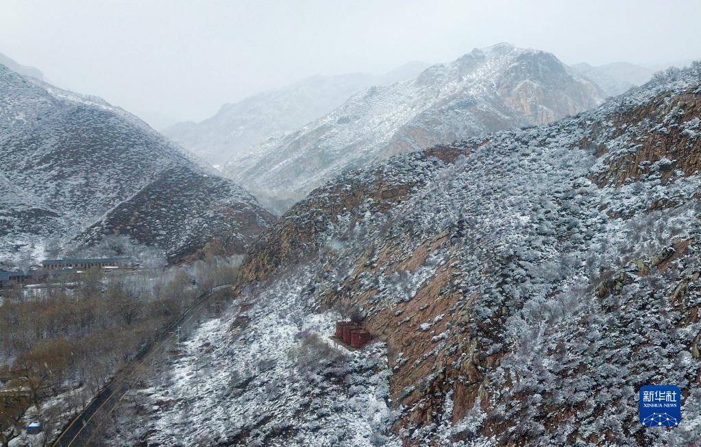 4月28日拍摄的内蒙古自治区呼和浩特市北郊的大青山自然保护区雪景(无人机照片)。