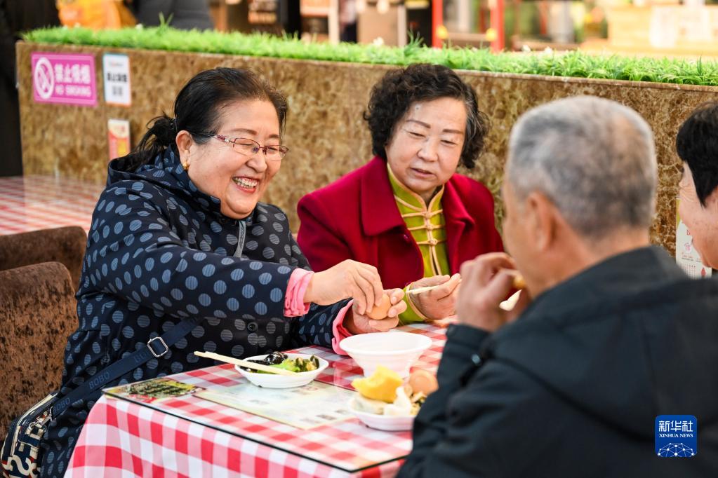 4月28日,老年人在伊金霍洛旗助餐点之一的福馨自助餐厅用餐。