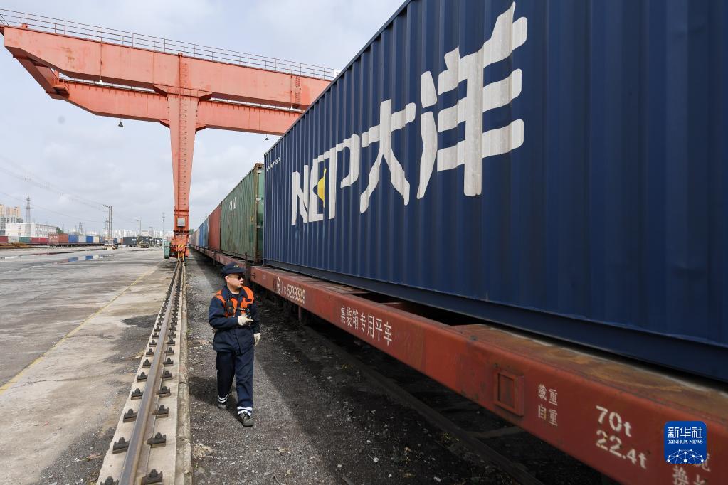 4月28日,工作人员在进行班列开行前的检查工作。