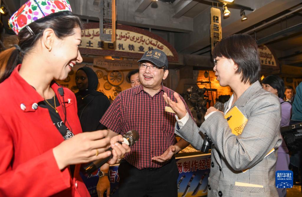 在新疆喀什古城景区铁匠巴扎,印度尼西亚驻广州总领事斌德加(中)和喀什当地导游(左)聊天(4月24日摄)。新华社记者 胡虎虎 摄