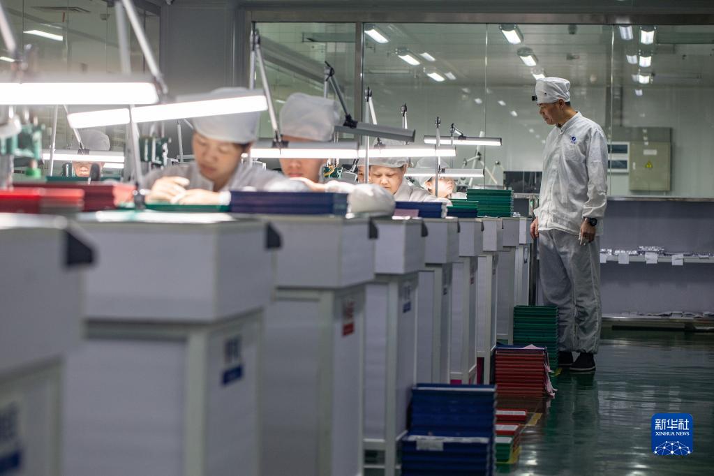 4月25日,在位于深圳的飞亚达钟表大厦,刘中华(右)在手表装配线上对工人进行技术指导。新华社记者 毛思倩 摄